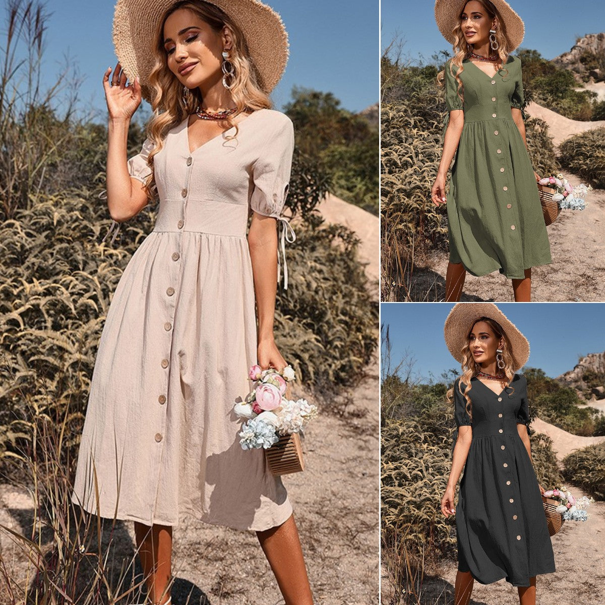 š2025 noua fusta lunga din bumbac si in Rochie de dama cu decolteu in V de culoare uni
