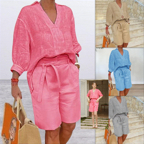 🔥【S-5XL】2025 Hot vânzare costum nou cazual de dama de vară din bumbac și in 【Top + pantaloni scurți】