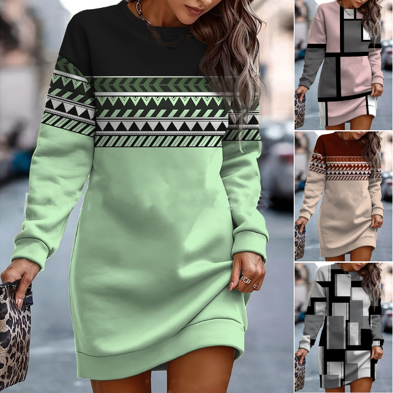 [S-3XL] Jesensko-zimska obleka z okroglim izrezom z novim potiskom v kontrastni barvi, pulover z okroglim izrezom