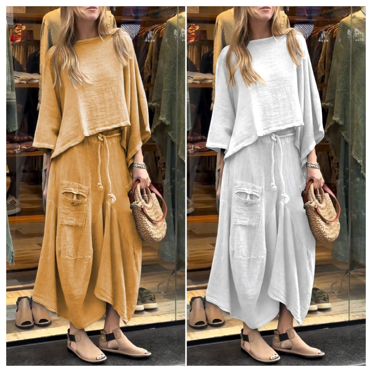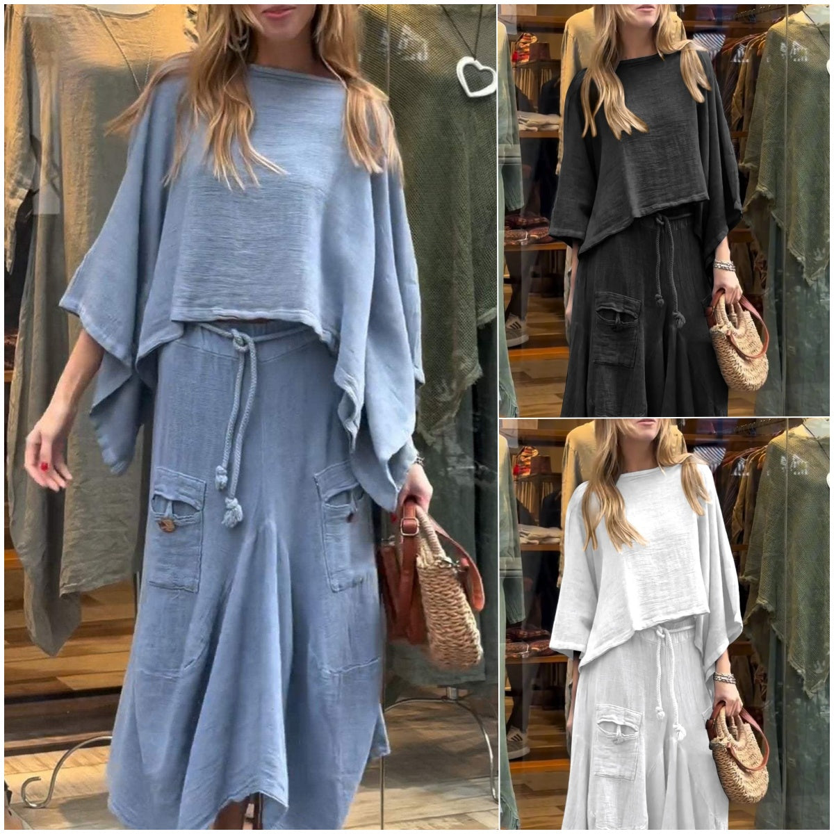 [🔥Oferta ograniczona czasowo] Dwuczęściowy komplet z bawełny i lnu, z okrągłym dekoltem i średnimi rękawami (top + spódnica)