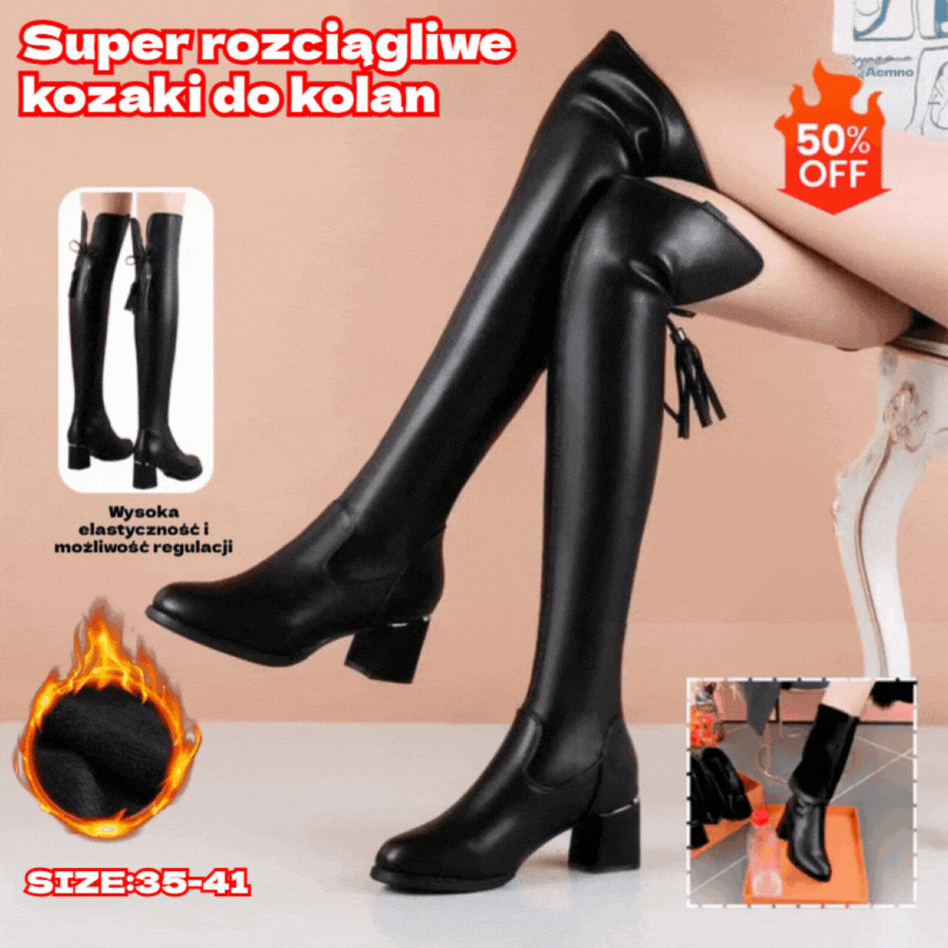 【50% ZNIŻKI】💥35-41💥Modne elastyczne kozaki za kolano – czarne, wysmuklające, z grubym obcasem na zimę 2025