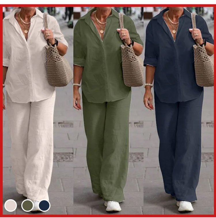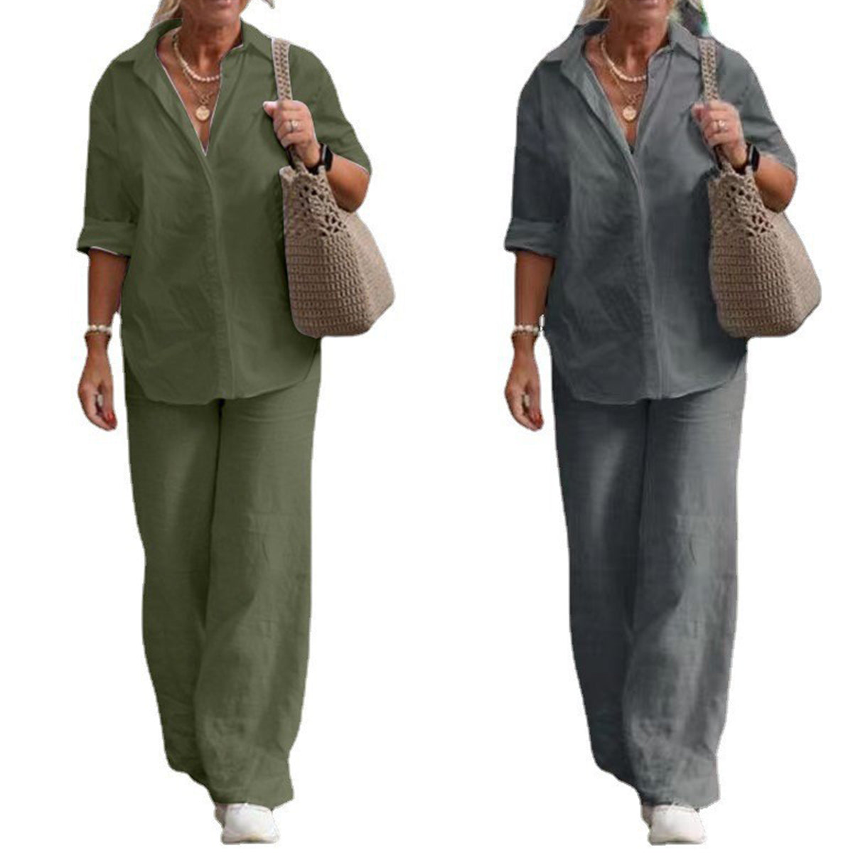 💓🍂Košulja dugih rukava s reverom, rana jesen, ležerne jednobojne hlače, široko dvodijelno odijelo