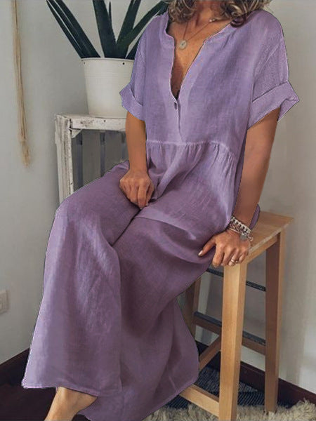 【40~100kg】Ljetna ležerna pamučna lanena haljina kratkih rukava s V izrezom 2023
