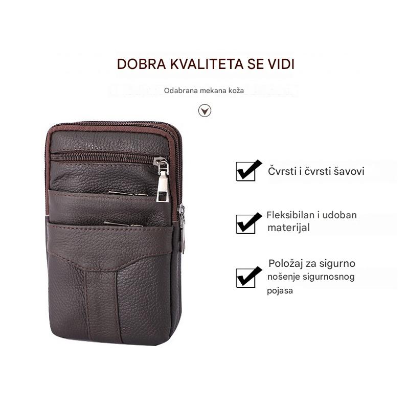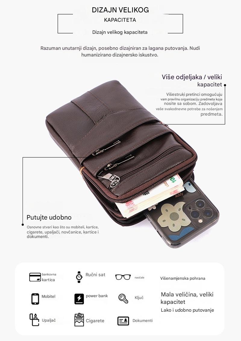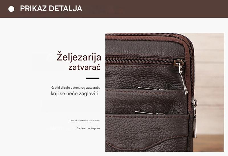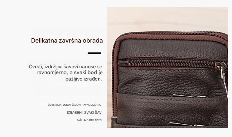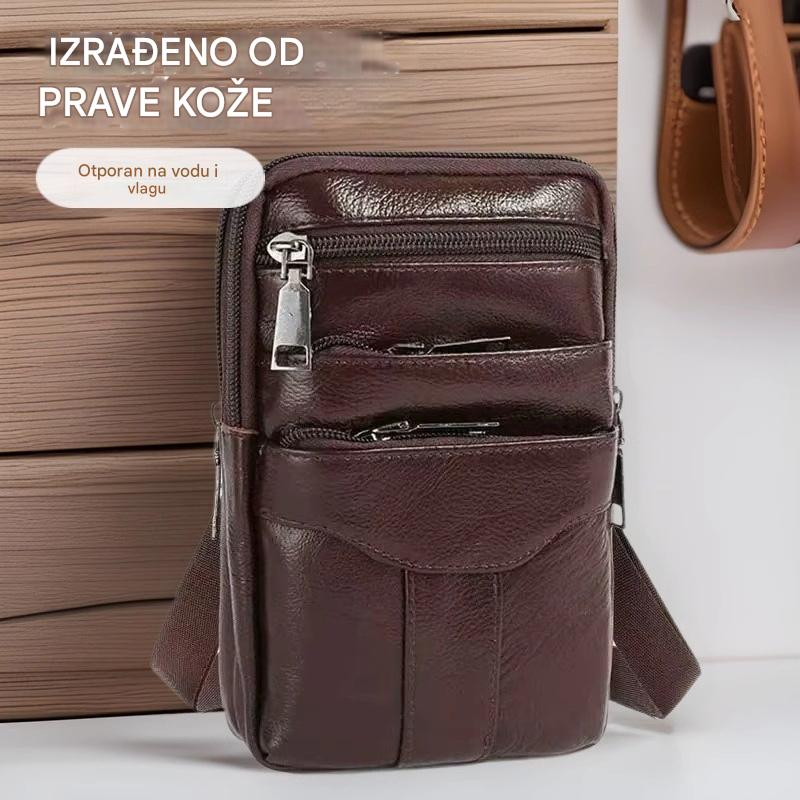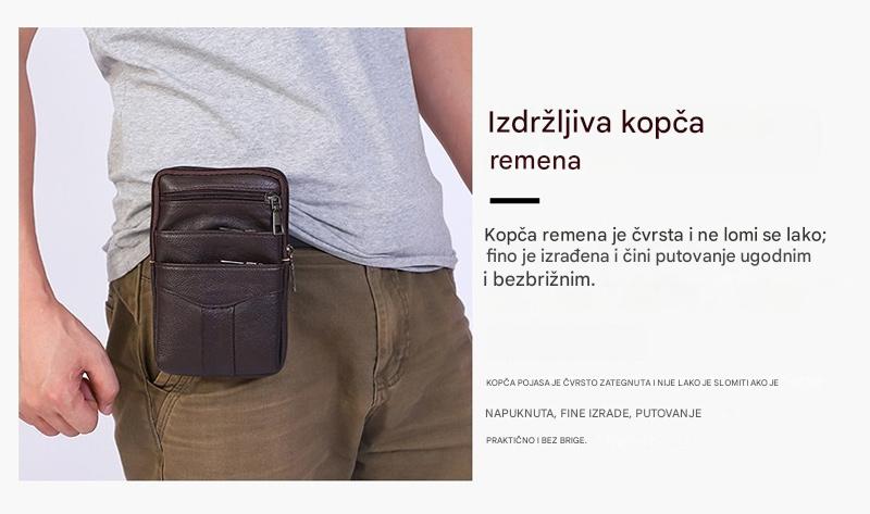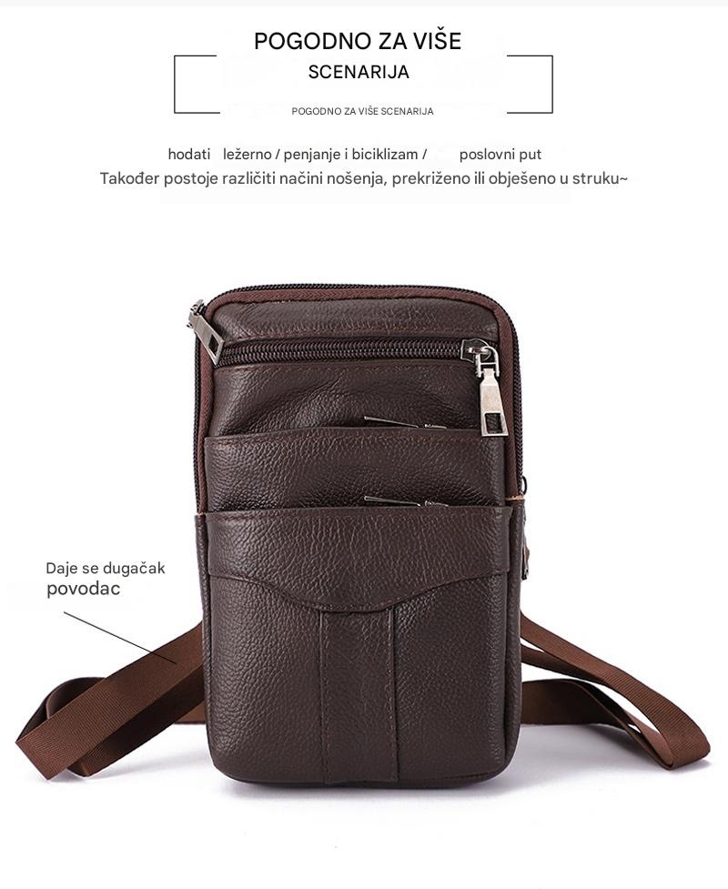Muška torba za struk, torba za preko ramena, torba od prave kože, višeslojna i prenosiva, dvostruki patentni zatvarač, može se opremiti kožnim remenom i držačem za mobitel