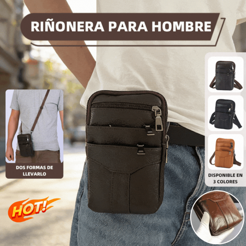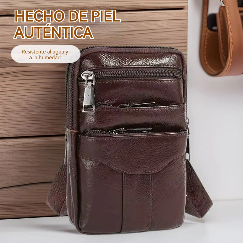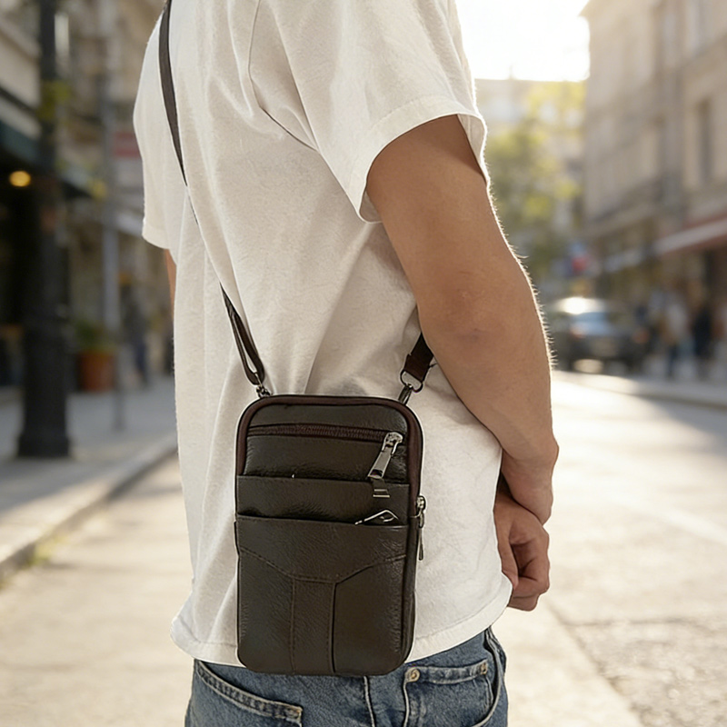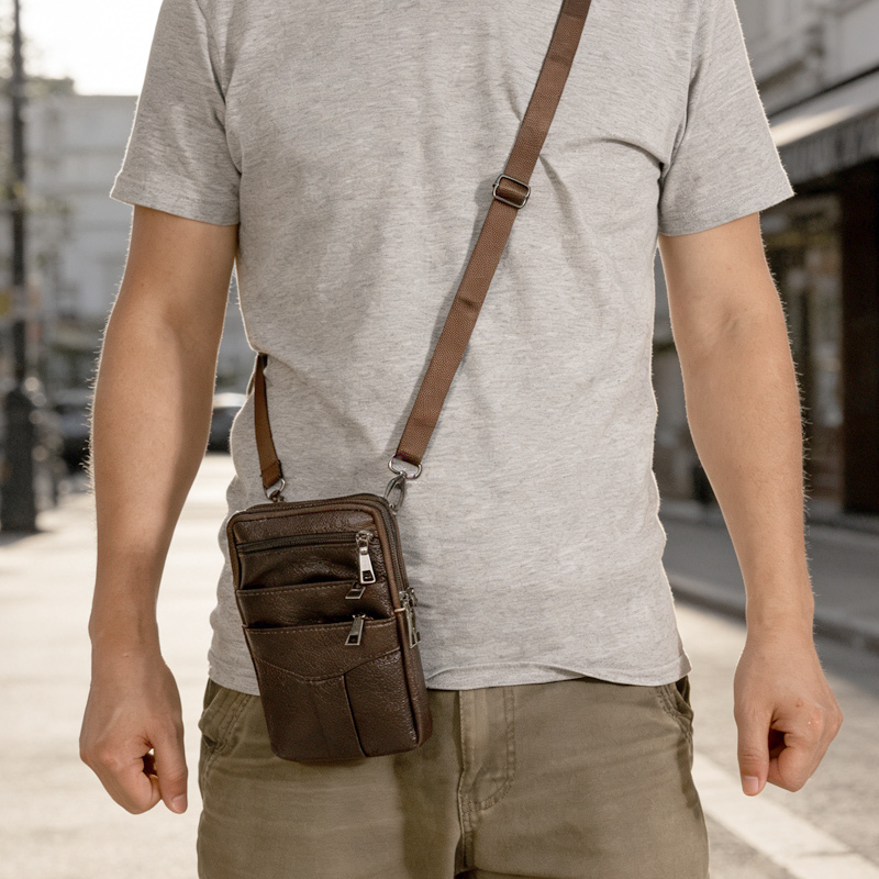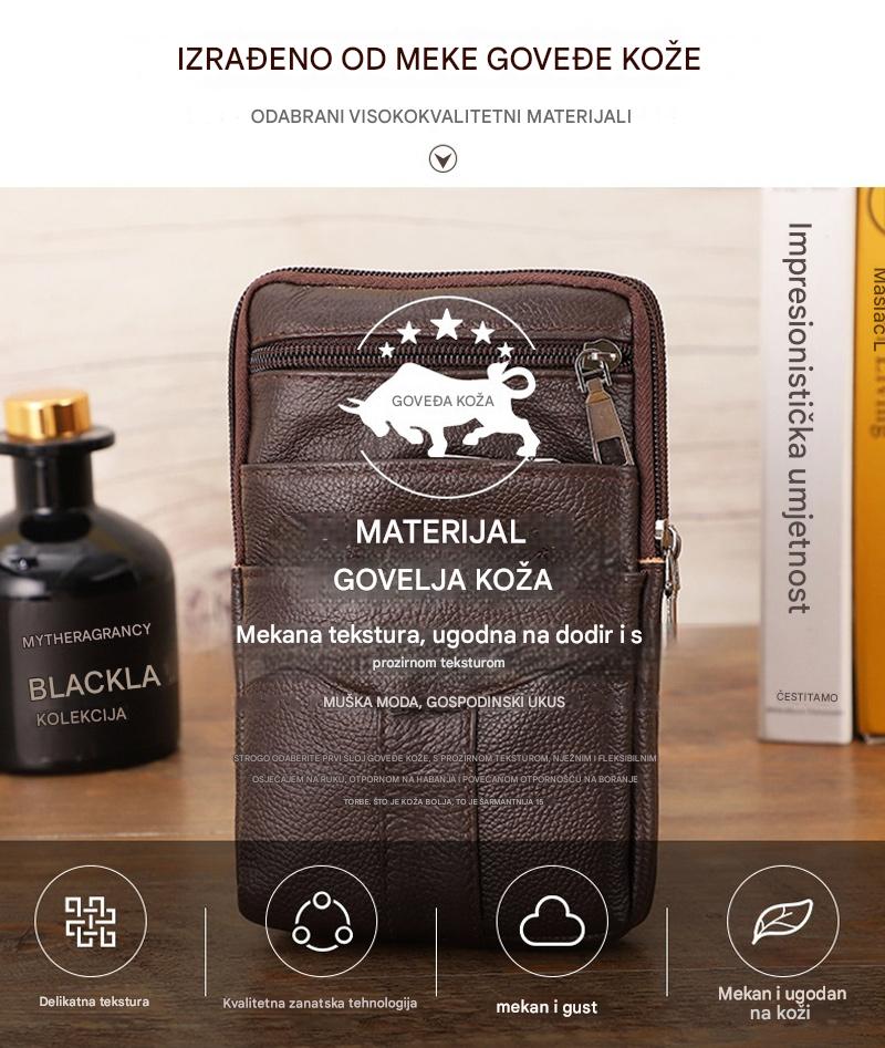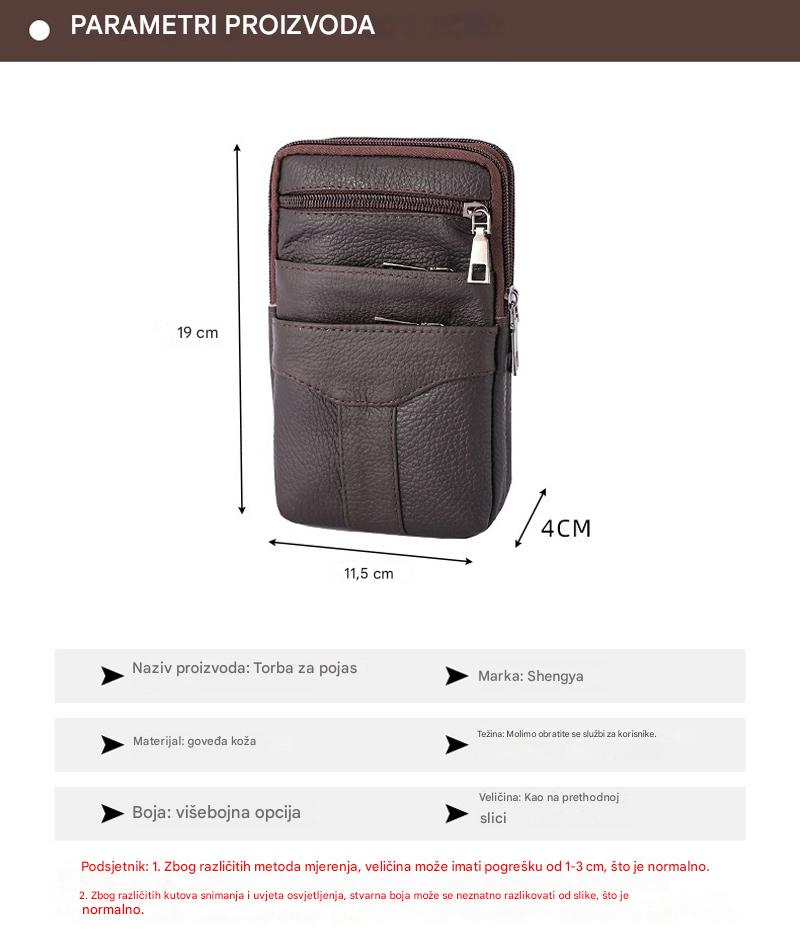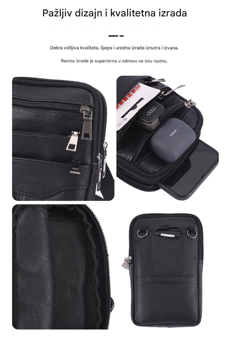 Muška torba za struk, torba za preko ramena, torba od prave kože, višeslojna i prenosiva, dvostruki patentni zatvarač, može se opremiti kožnim remenom i držačem za mobitel