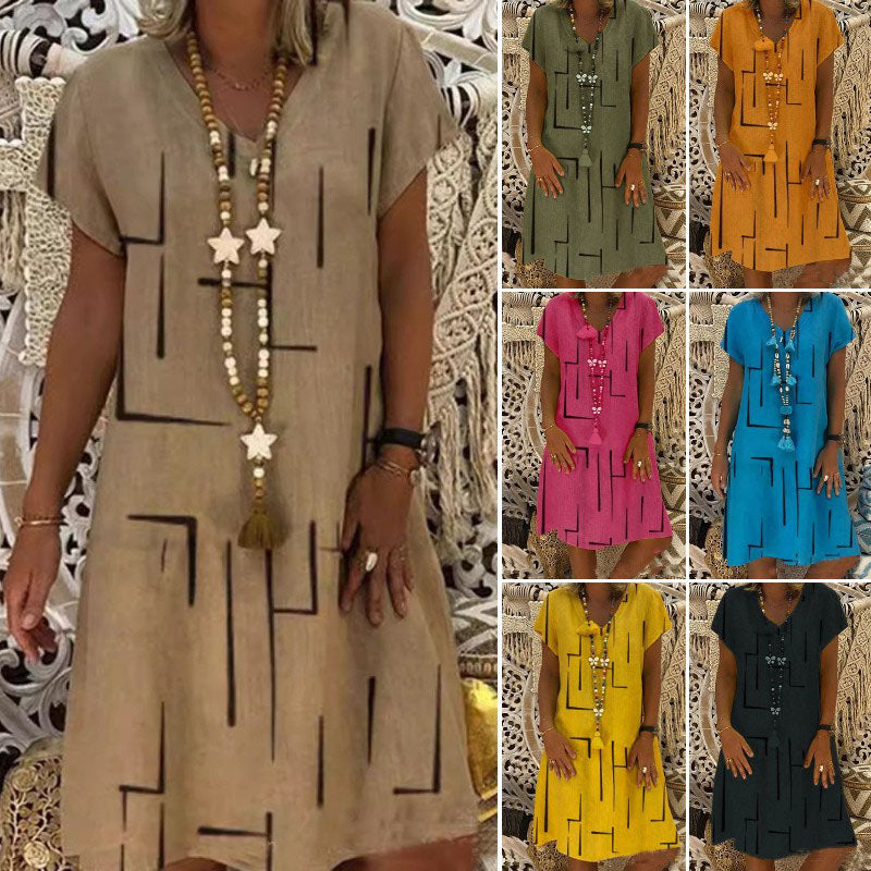 🔥✨【S-5XL】Rochie nouă din bumbac și in, cu decolteu în V, cu imprimeu ✅Prăgător cu pielea și moale✅La modă și casuale